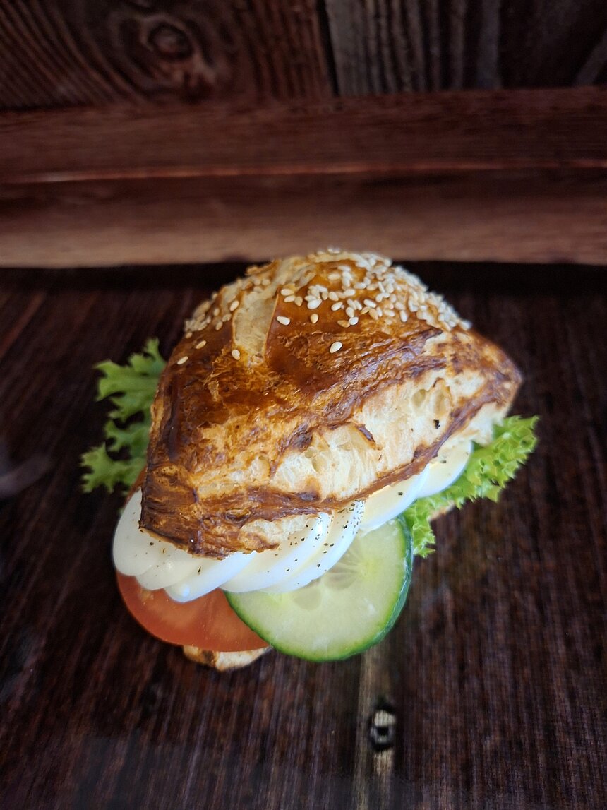 Laugenecke, Remoulade, Salat, Gurke, Tomate, gekochtes Ei