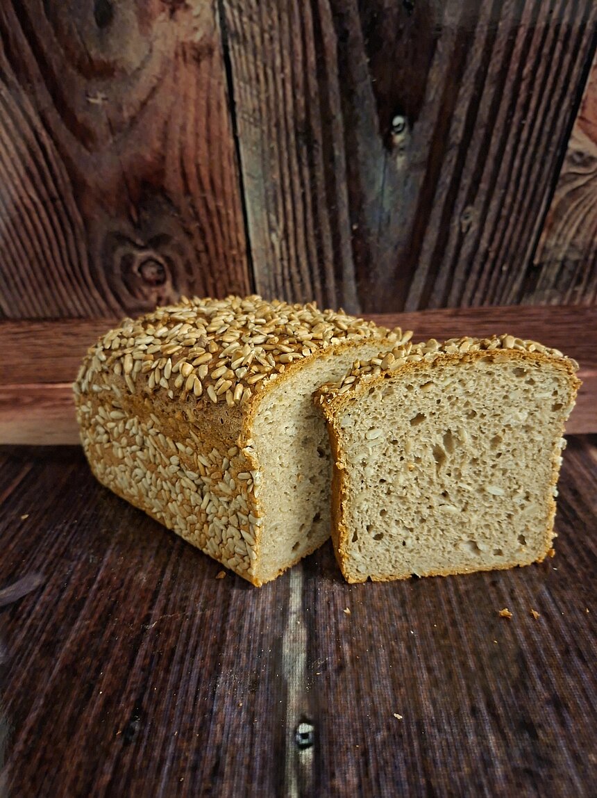 Ein herrlich saftiges Brot, im Kasten gebacken, mit vielen Sonnenblumenkernen, kräftigem Natursauerteig und ohne Weizenmehl